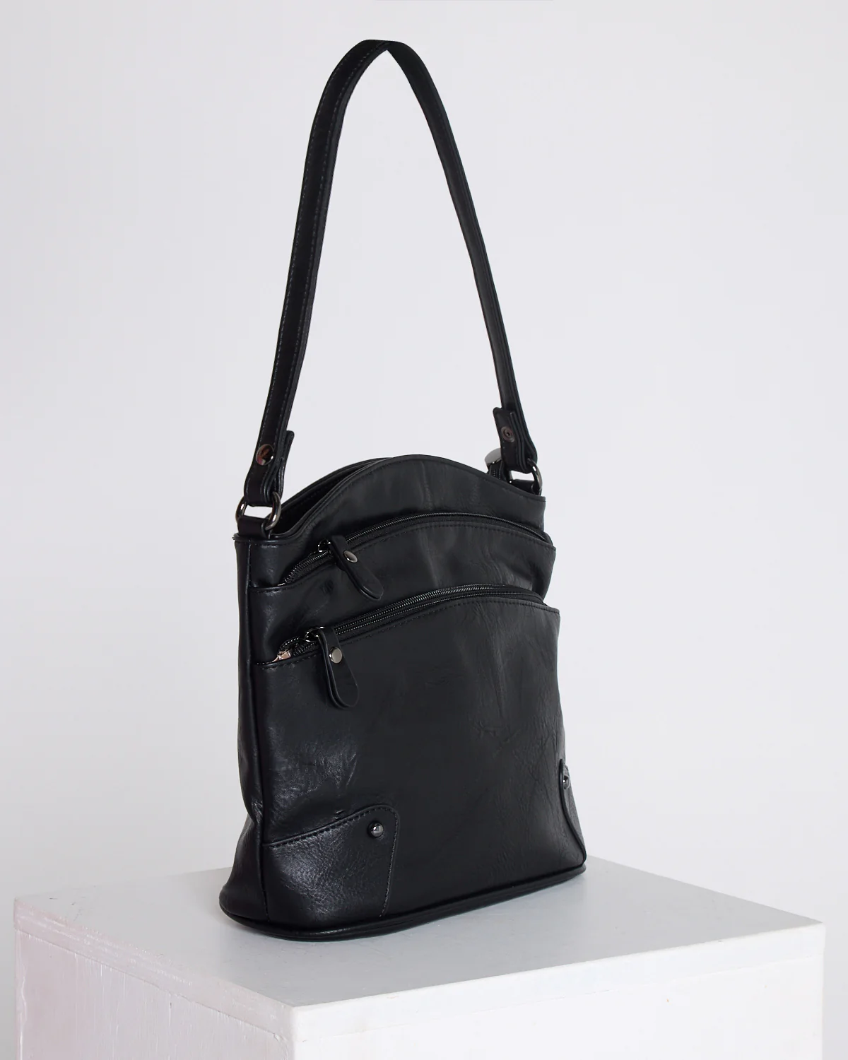 This stylish and practical black handbag is the ultimate organiser for everyday life and travel. Crafted from supple man-made leather, it features a clever multi-compartment design that offers maximum storage without compromising on style. The bag comes with two interchangeable straps—a long, adjustable strap for hands-free crossbody wear and a shorter strap for classic overarm styling. With thoughtfully designed zippered sections, internal pouches, and card slots, this bag keeps everything in its place while looking effortlessly chic.