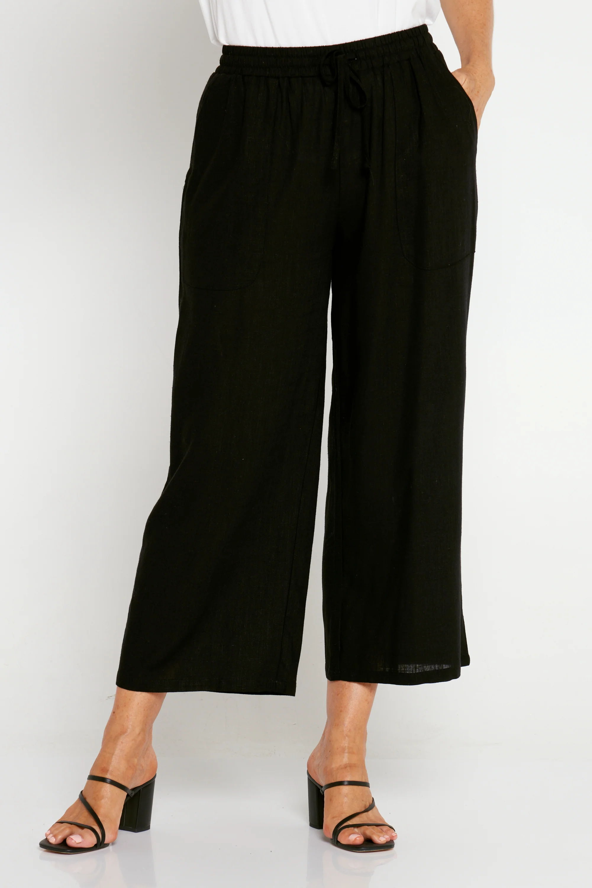 Elevate your style with the Aiko Linen Pants, now available in essential plain black. The broad elasticated waistband with a drawstring offers both comfort and a customisable fit. Functional front pockets seamlessly merge practicality with style. The wide leg design and cropped culotte length bring a contemporary flair, ensuring you stand out with every step. Crafted from a non-stretch weave, these pants provide a structured silhouette and natural drape. Embrace comfort and sophistication effortlessly with the versatile and stylish Aiko Linen Pants.