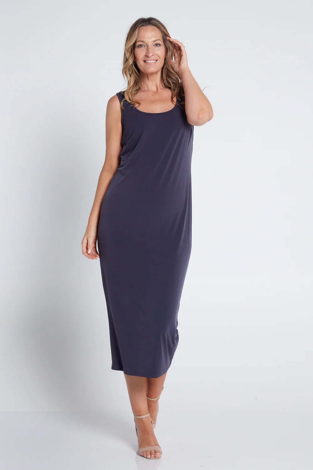 The Amy Midi Slip is a wardrobe essential and now comes in a new neutral, this time smokey charcoal grey. Your wardrobe won't be complete until you add this stylish midi to your collection. So versatile, you can dress it up or down with layers, accessories and shoes. The stretch jersey conforms to your shape and the scoop neck and tank sleeves create an elegant silhouette.