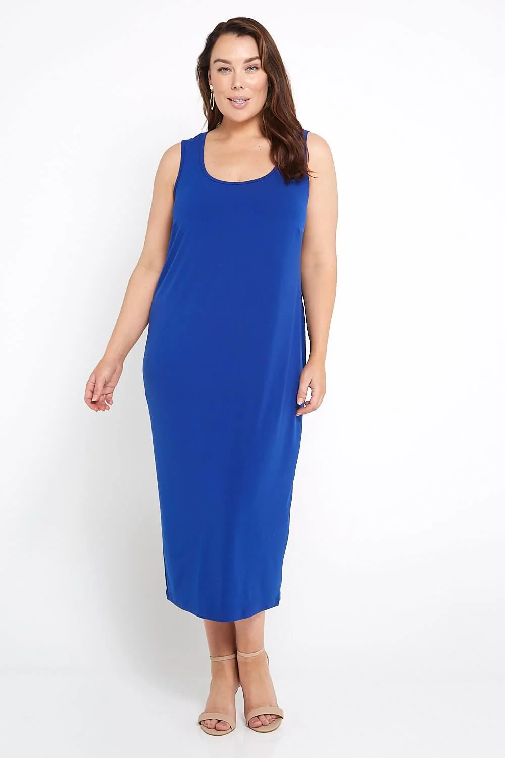 Make a statement in Royal Blue. We know your wardrobe won't be complete until you add this stylish midi to your collection. So versatile, you can dress it up or down with layers, accessories and shoes. The stretch jersey conforms to your shape and the scoop neck and tank sleeves create an elegant silhouette.