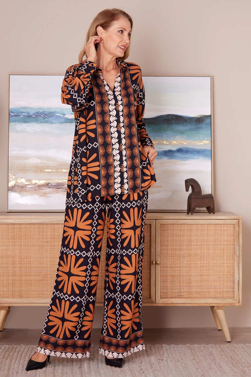 Introducing the Aurora Pants - 70's Terracotta. These pants feature a striking geometric print in rich black and tan hues, creating a captivating and modern look. Designed with both comfort and elegance in mind, the Aurora Pants offer a wide-leg silhouette that flows beautifully with every step.