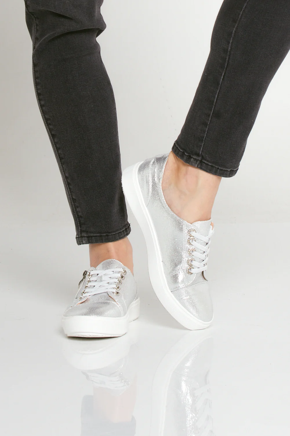 Step into style with our Cara Sneakers in Silver. The metallic outer gives a touch of glam, while the elastic laces and diamanté encrusted lace holes provide functionality and added sparkle. Plus, the comfortable inner soles and wide, gripped soles make these sneakers perfect for all-day wear.