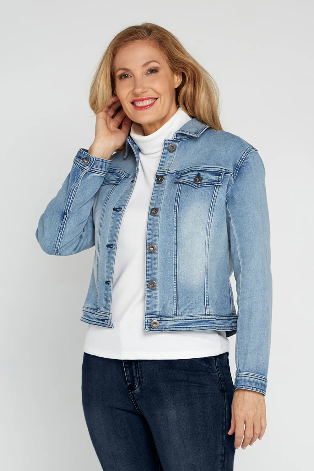 The Carolyn Denim Jacket is cropped, in length with long sleeves gunmetal grey buttons and stretch cotton denim for an easy fit. Strategic fading gives it a well worn, well loved look, while the light wash denim blue is such a pretty hue.