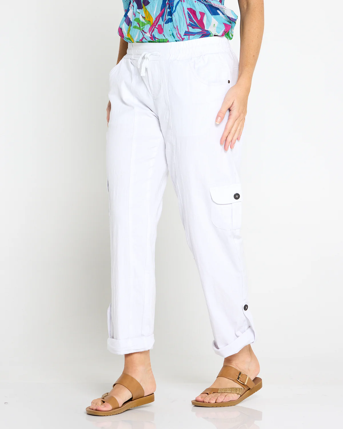 Fresh, breathable, and endlessly versatile, these white cargo pants are a staple for effortless everyday style. Made from a soft linen blend with a touch of stretch, they offer a relaxed tapered silhouette that feels just right on warmer days. Designed with utility in mind, they feature multiple pockets, a comfy elastic waistband with drawstring, and adjustable hems you can roll and secure for a casual cropped look. Perfect for pairing with bright prints or soft neutrals.