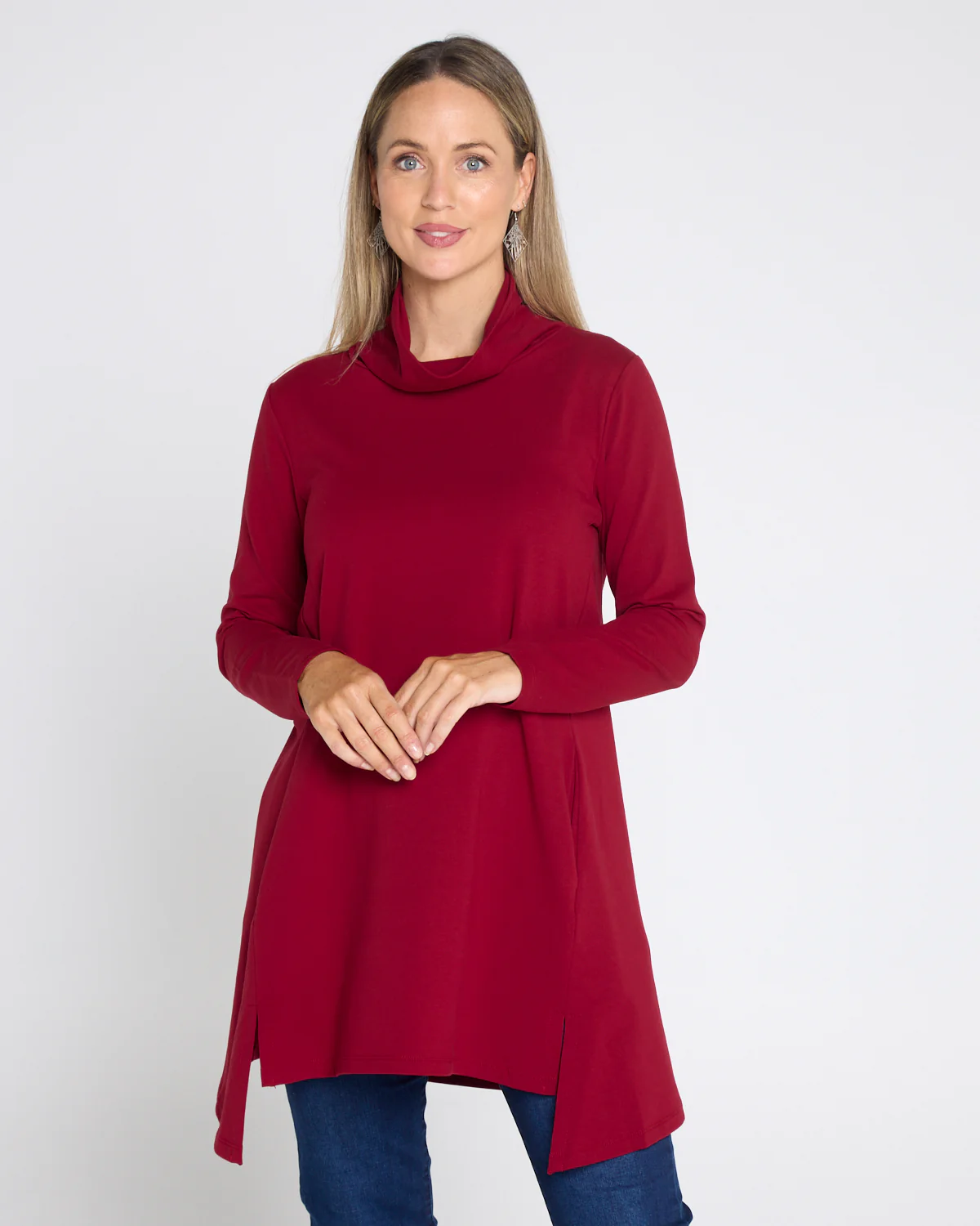 The Joslin Cowl Tunic is an elegant staple style for the cooler months. The cut is easy fitting, with long lines for extra coverage, making it ideal for layering over leggings or jeans during autumn and winter. With a generous length, long sleeves, a cowl neck and pockets, it feels cosy and warm, while the silhouette is simple enough to keep it sophisticated. The deep, ruby red exudes an effortless confidence.