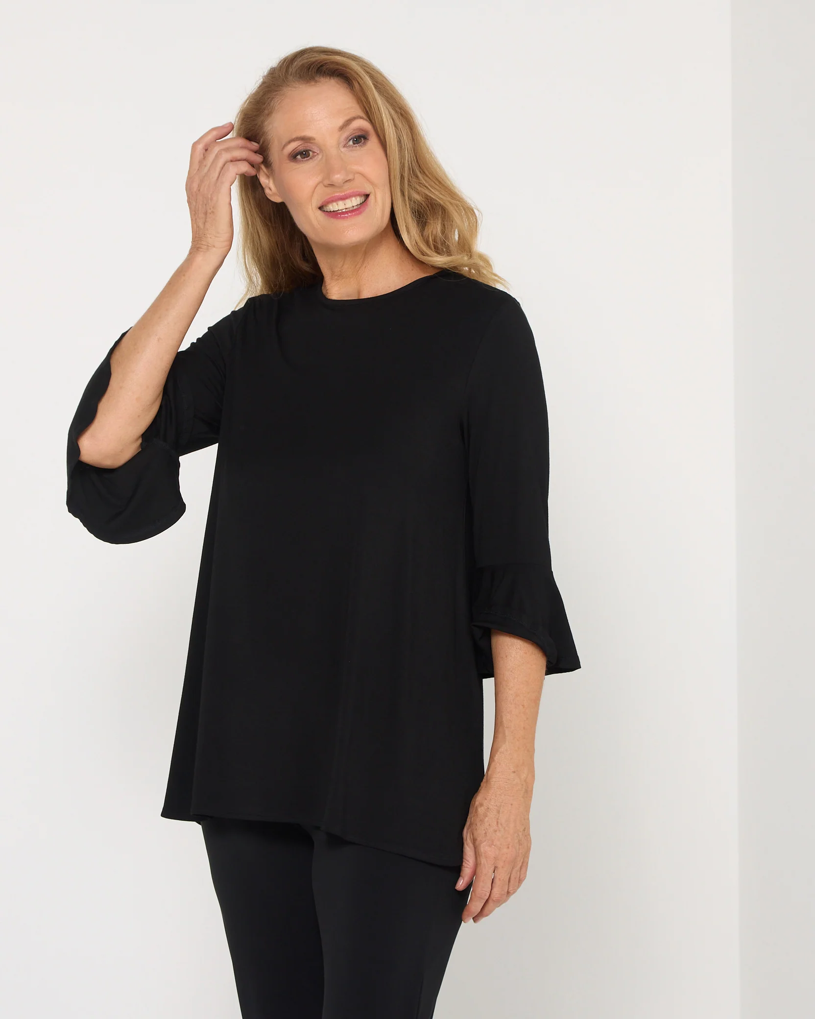 Crafted with a three quarter sleeve and a fluted cuff. Combined with the basic black colourway, it gives a modern take on femininity.