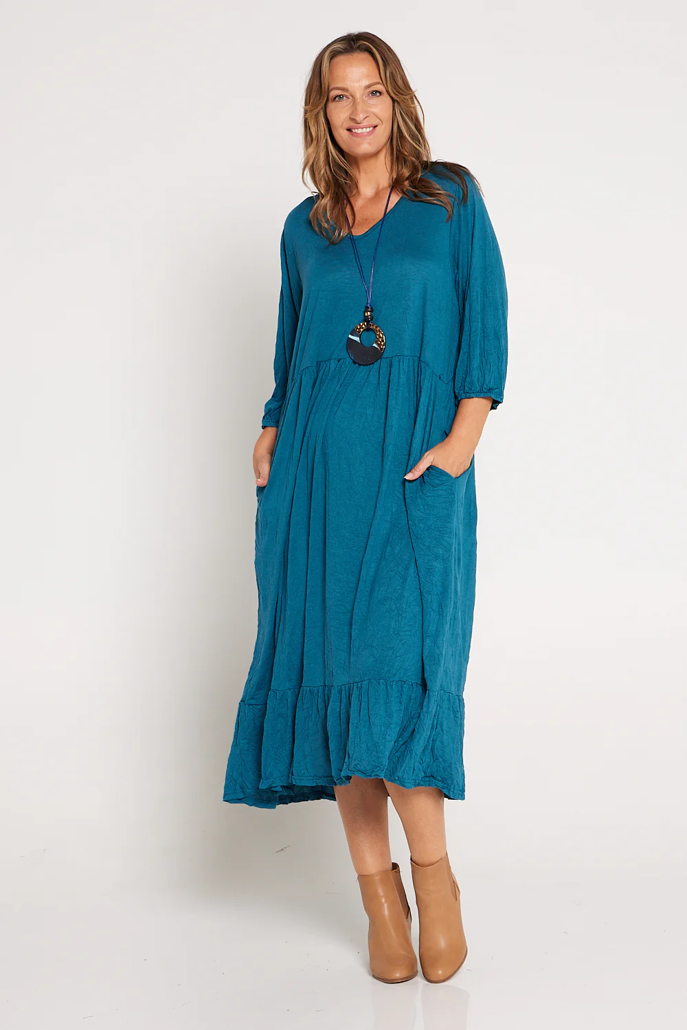 It's always an exciting day the Cotton Village releases a new style. You may be a Cotton Village aficionado or curious about testing the waters, either way, we know you'll love the new Leith Dress. Cut with a long sleeve, it provides sun protection in summer and extra warmth in winter. In the tradition of Cotton Village, it's relaxed and easy fitting, but brings in beautiful design details such as the elasticised cuffs and fluted panel at the hem. The crinkled jersey is soft on the skin and doesn't need ironing (what a bonus), while the beautiful teal blue can be styled for any season.