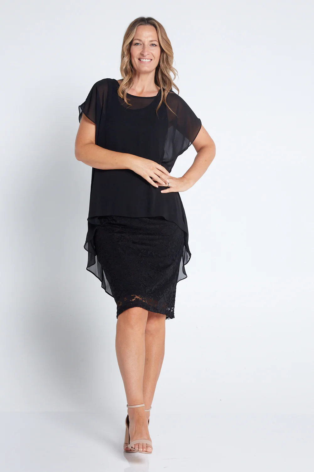 The Ophelia now comes in sleek black! Contemporary elegance is exemplified by RTM. Made in Australia, this style combines traditional lace with stylish chiffon to create a truly sophisticated design. The lace sheath is fully lined with a solid stretch fabric that hugs the body and provides the base for the layer of lace, featuring a detailed floral pattern. The chiffon overlay drapes loosely over the top, with a modest sleeve and high/low hem, which is flattering from any angle. The overlay flows beautifully as you move, and adds to the effortlessness of this special occasion dress.