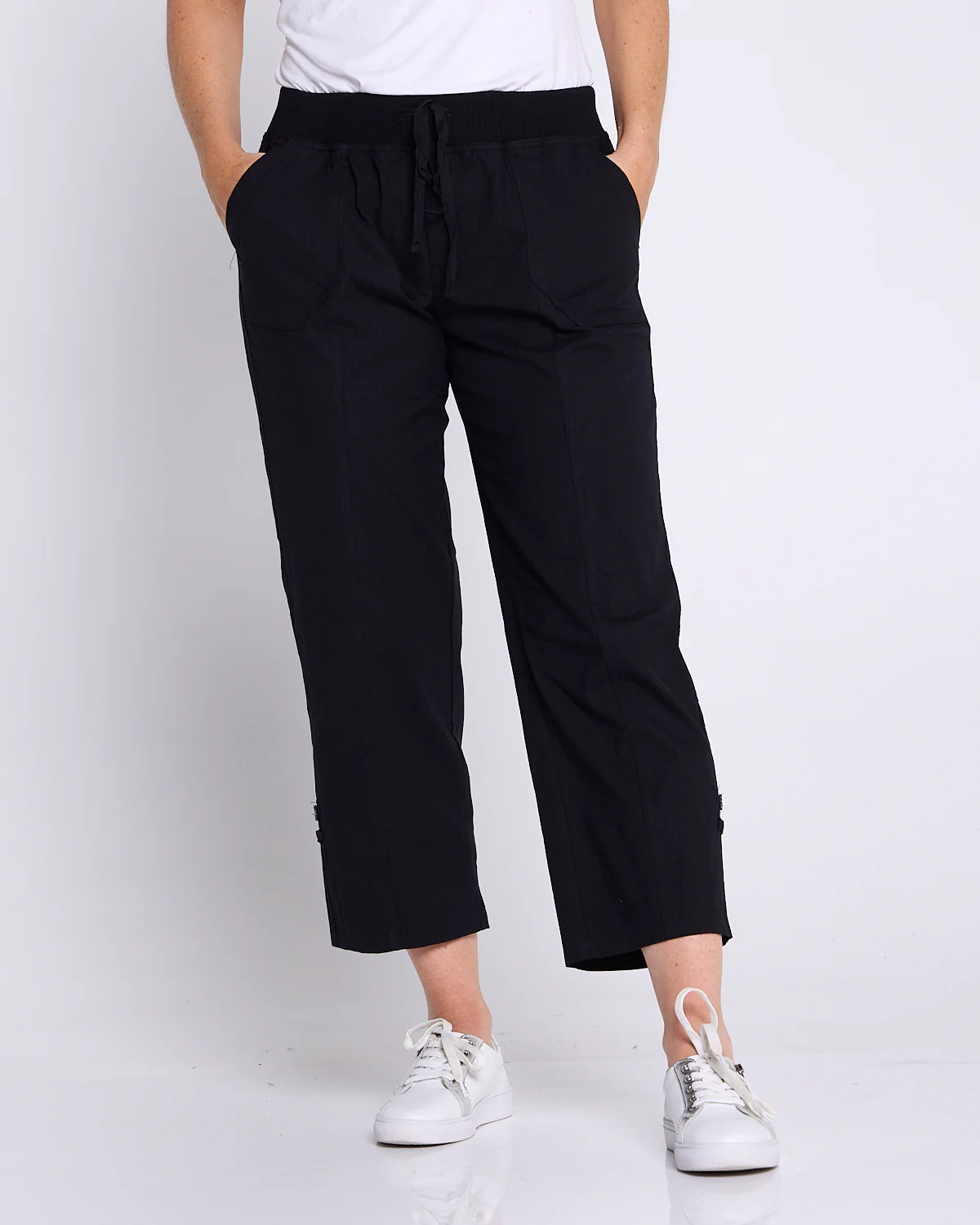 The Sammy Cargo Capri is your go-to for effortless, everyday style with a practical twist. Crafted from a lightweight linen-rayon blend, these capris are breathable yet soft, making them perfect for warm weather wear. Designed with a wide ribbed waistband and drawstring, they offer ultimate comfort and a flexible fit. Functional front and back pockets add a touch of utility, while the button tab at the hem allows you to roll them up for a shorter, more casual look. Pair with sneakers and a tee for laid-back weekends, or dress them up with sandals and a linen blouse for easy summer polish.