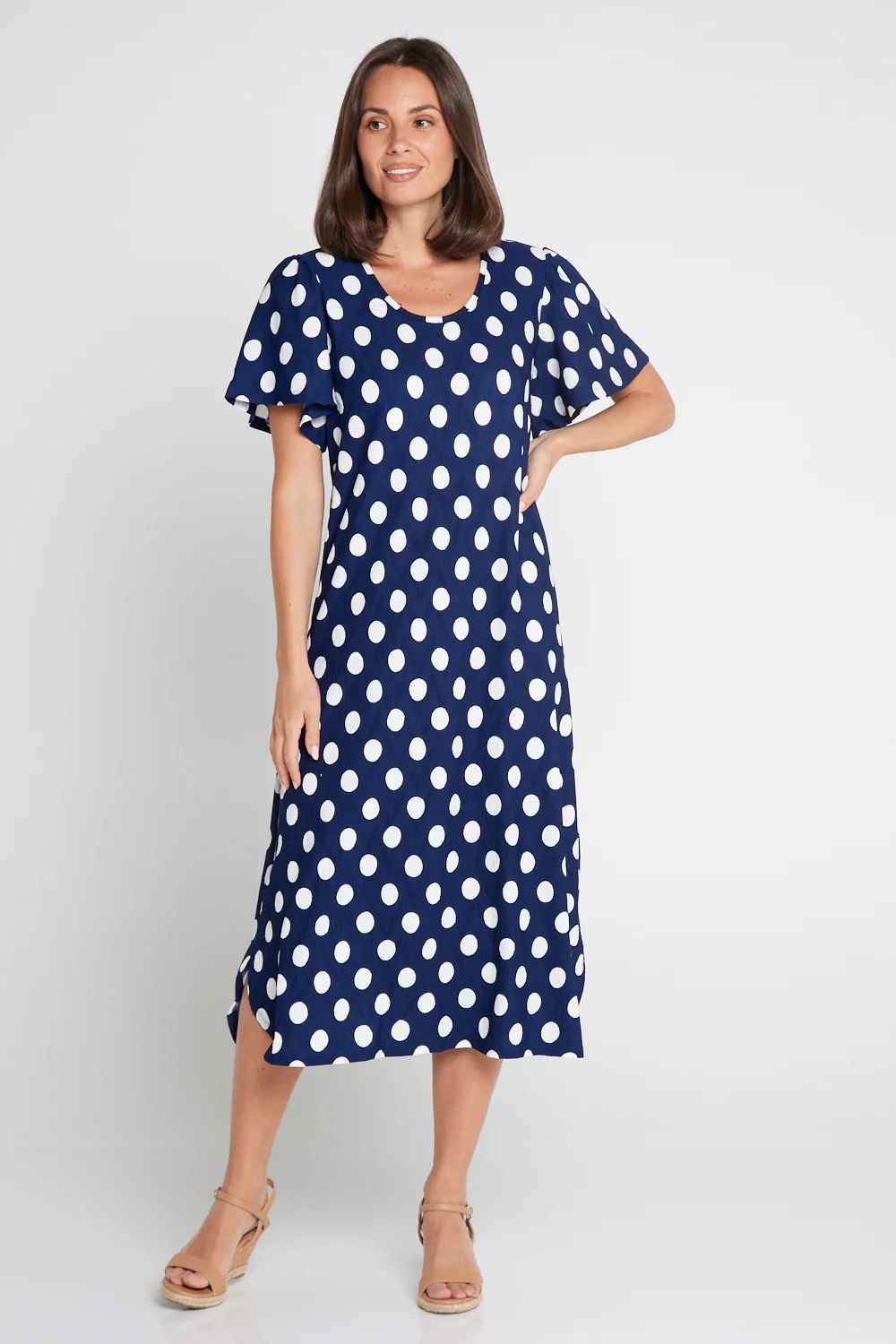 The Spotina Dress in Navy/White Spot is a must-have for any fashion-forward wardrobe! Its V-neck and angel-style short sleeves create a feminine and elegant silhouette. The side splits at the hem add a touch of playfulness, while the crinkle texture with stretch offers comfort and versatility. Perfect for any occasion, this dress will make you feel confident and stylish.
