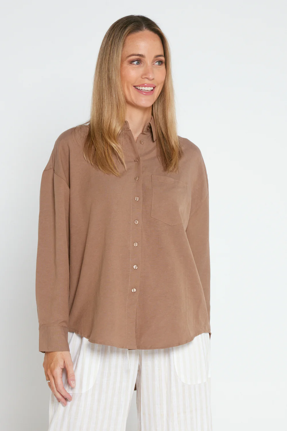 The Tiffany Shirt now comes in a lovely warm brown shade. Experience the epitome of classic elegance with this sophisticated linen-viscose blend shirt. Designed to offer a perfect balance of luxury and comfort, this shirt features a smooth texture that feels soft against the skin. The neutral mid brown shade is easy to pair with, making it a versatile addition to any wardrobe. It comes with a neat collar, button-down front, and long sleeves with buttoned cuffs that can be rolled up for a more relaxed look. A single patch pocket on the chest adds a touch of functional charm. Ideal for office wear or casual outings, this shirt pairs beautifully with tailored pants or skirts, creating a look that is both polished and effortlessly chic.