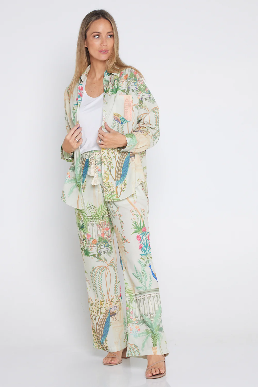 These enchanting trousers features a refreshing mint green base adorned with a vibrant botanical print that showcases lush greenery, exotic birds, and delicate floral accents. The playful yet sophisticated design makes it a standout piece for any wardrobe.